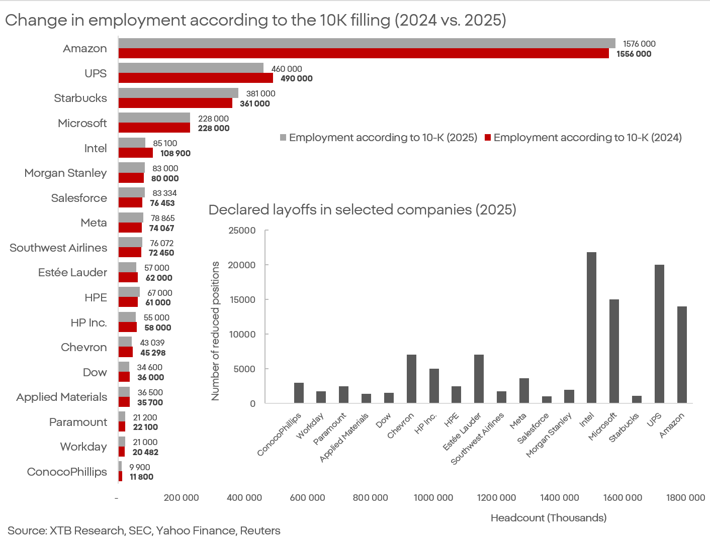 Finanční výkazy nebo konferenční hovory se jen zřídka, pokud vůbec, soustředí na počet zaměstnanců. Americké firmy ale mají regulatorní povinnost uvádět počet zaměstnanců ve svých formulářích 10-K. A právě ty vykreslují obraz, který je od veřejných prohlášení dramaticky odlišný.