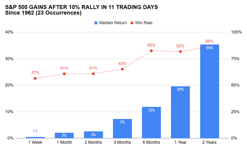 - Silná krátkodobá rally indexu S&P 500 o zhruba 10 % během 11 dnů je historicky vzácnou událostí a vysílá smíšené signály do budoucna. Historická data však naznačují spíše umírněné výnosy v krátkém horizontu, ale potenciálně vyšší zhodnocení v delším období.