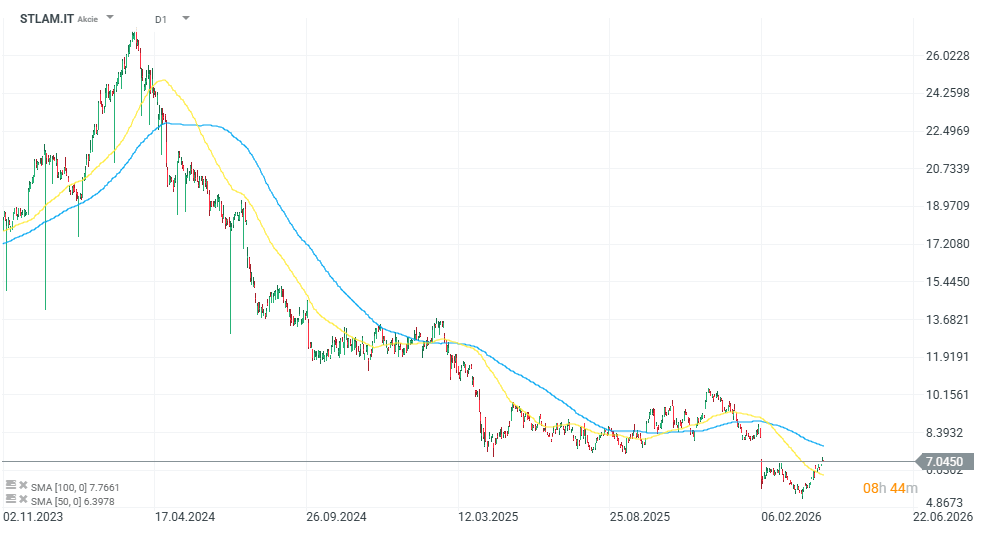 Stellantis, pod který spadají značky jako Peugeot, Opel, Citroën, Fiat nebo Maserati, prochází v posledních letech výraznou korekcí. Akcie společnosti se nyní obchodují kolem 7 eur, za posledních 12 měsíců ztratily přibližně 15 %, za posledních pět let odepsaly zhruba 54 % a ze svých maxim z roku 2024 jsou níže o více než 70 %.