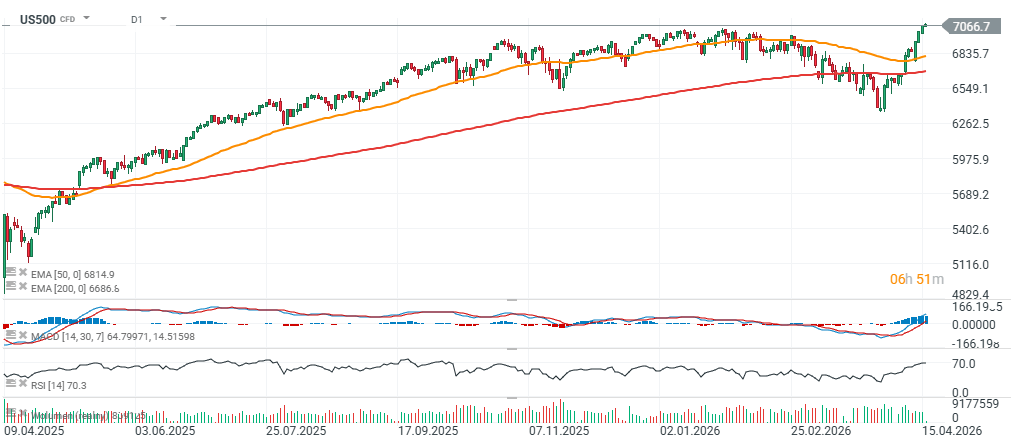 Indexy na Wall Street zahájily dnešní obchodování bez větších změn. S&P 500 se obchodoval beze změny, zatímco Dow Jones, Nasdaq a Russell 2000 posílily přibližně o 0,1 %. Futures na index S&P 500 (US500) se včera vyšplhaly nad hranici 5 000 bodů, ale hotovostnímu indexu se zatím nepodařilo tuto hranici překonat. Může se tak však stát dnes vzhledem k tomu, že se hotovostní index při zahájení seance obchoduje v blízkosti 4 995 bodů. -
