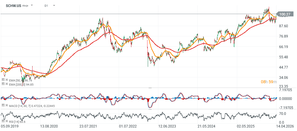 Akcie Charles Schwab dnes ztrácejí více než 4 % poté, co společnost zveřejnila smíšené výsledky za první čtvrtletí 2026. Ziskovost překonala očekávání, ale tržby byly mírně pod prognózami. Společnost vykázala očištěný zisk na akcii 1,43 USD, což je nad odhady 1,39 USD a výrazně více než 0,99 USD před rokem.