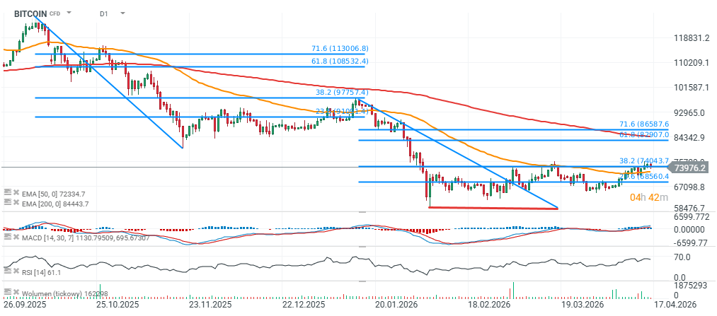 Při pohledu na Fibonacciho retracementy lze vidět určité podobnosti mezi současným poklesem a tím předchozím. Prodejní tlak se znovu objevil kolem 38,2% Fibonacciho retracementu lednového poklesu, stejně jako tato úroveň fungovala jako klíčová rezistence během předchozí medvědí vlny, která začala na podzim 2025 a skončila prudkým propadem po odmítnutí v blízkosti 97 700 USD. Aktuálně se zóna 74 000 až 75 000 USD jeví jako podobně důležitá technická rezistence, která může vyvolat buď výrazný průraz směrem vzhůru, nebo další silný pokles.