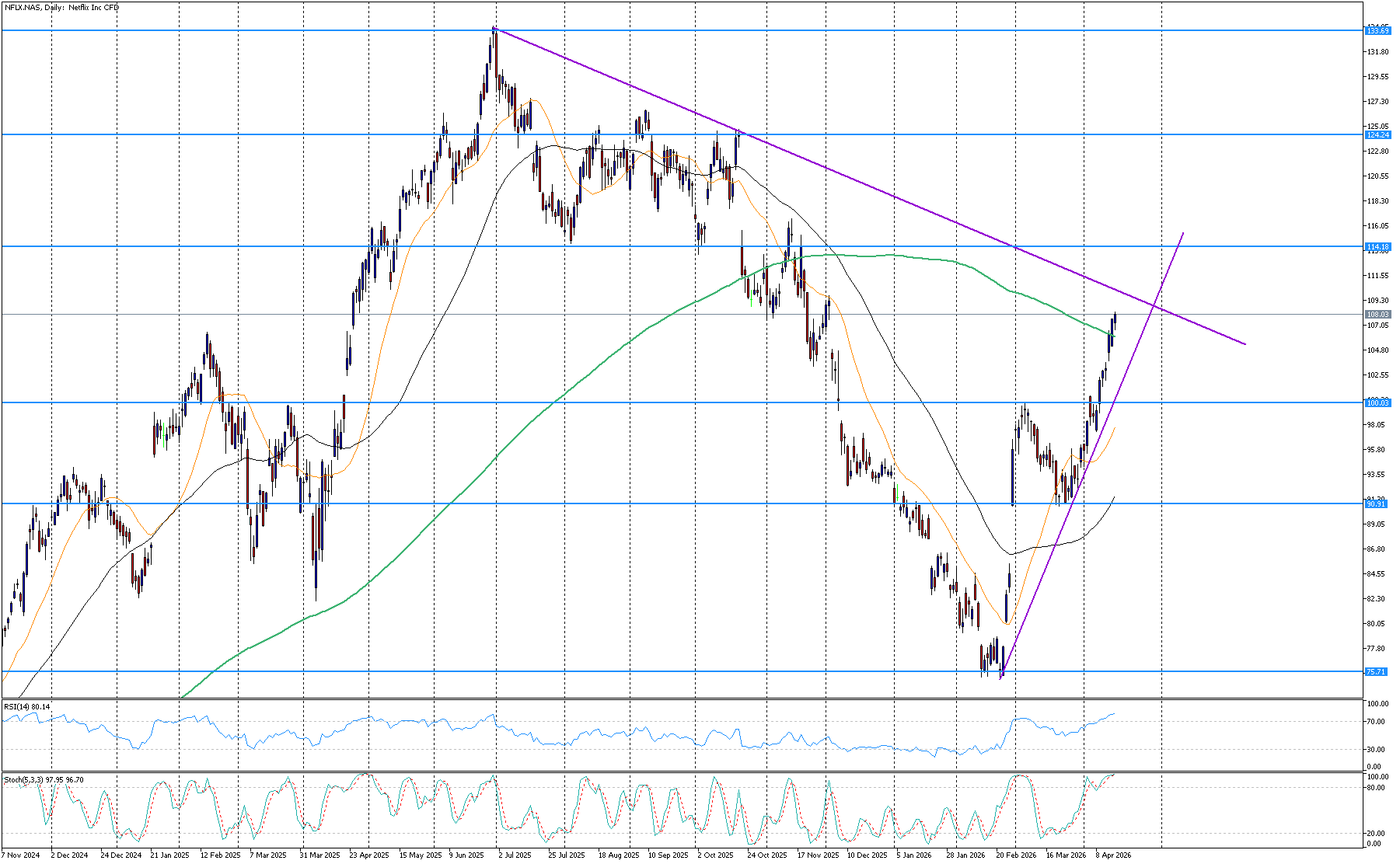 Netflix se po výrazném oživení dostává zpět do centra pozornosti investorů, když se jeho akcie stabilizují nad psychologickou hranicí 100 USD. Od konce února titul posílil o téměř polovinu své hodnoty, což odráží kombinaci technického obratu a zlepšujících se fundamentálních očekávání. Odraz od oblasti kolem 75 USD tak vytvořil pevný základ pro současný růstový impuls, který nyní testuje klíčové dlouhodobé úrovně. Aktuálně se trh soustředí na pokus o průlom nad 200denní klouzavý průměr, což by znamenalo důležitý signál změny trendu po několikaměsíčním medvědím období. Postupné odstraňování technických překážek zároveň podporuje pozitivní sentiment, který je podpořen i fundamentálním příběhem společnosti. Netflix se stále více orientuje na monetizaci reklamního segmentu a zároveň drží pod kontrolou náklady na tvorbu obsahu, což zvyšuje důvěru investorů v udržitelnost růstu. Výhled zůstává konstruktivní i z pohledu trhu, kde převažují očekávání stabilního dvouciferného růstu tržeb i zisku. Analytické domy nadále podporují nákupní doporučení, což přispívá k pokračujícímu zájmu o titul. Přesto však aktuální cenová úroveň naznačuje, že další růst nebude bez překážek a může vyžadovat silnější fundamentální impulz. Technicky se akcie nacházejí v oblasti, kde se koncentruje několik významných rezistencí. Nejbližší bariéra leží v okolí 107,75, kde se nachází dlouhodobější klouzavý průměr, zatímco nad úrovní 110 USD se formuje klesající trendová linie z minulého roku. Průlom nad tuto oblast by mohl výrazně zlepšit technický výhled a otevřít prostor pro pokračování růstu směrem k vyšším cenovým úrovním. Na druhé straně indikátory momenta naznačují, že aktuální rally může být krátkodobě přehřátá. Překoupené podmínky zvyšují pravděpodobnost korekce nebo alespoň zpomalení růstu. Pokud by se akcie nedokázaly udržet nad 200denním průměrem, mohl by následovat návrat k nižším podporám, přičemž klíčová oblast se nachází v blízkosti 100 USD. V případě hlubší korekce by se pozornost přesunula k dalším technickým úrovním, které by mohly fungovat jako stabilizační zóny. Celkově Netflix vykazuje známky návratu býčího trendu, avšak další vývoj bude záviset na schopnosti trhu překonat klíčové rezistence. Udržení nad 110 USD by mohlo potvrdit pokračování růstu, zatímco selhání na těchto úrovních by mohlo vést k přechodné konsolidaci po předchozím prudkém posílení.