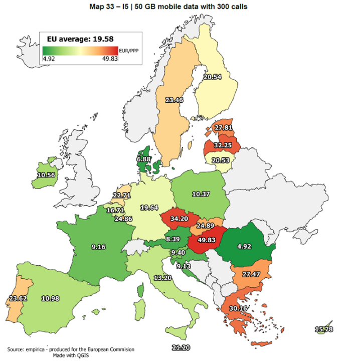 Ještě názornější je pohled na konkrétní modelový balíček pro náročnější uživatele. U tarifu zahrnujícího 50 gigabajtů dat a 300 hovorů činí průměr EU zhruba 19,6 eura (490 Kč) měsíčně. V Rumunsku lze přitom podobnou službu pořídit za necelých 5 eur (125 Kč), v Rakousku zhruba za 8 eur (200 Kč) a ve Francii kolem 9 eur (tedy 225 Kč). Česko se naopak pohybuje výrazně výše (přibližně 850 Kč) a patří k nejdražším trhům v celé Evropské unii. A to i po přepočtu na kupní sílu, tedy při zohlednění toho, kolik lidé v jednotlivých zemích vydělávají.