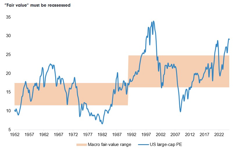 S tím, jak investoři vyhodnocují dopady různých makrofaktorů na výhled amerických akcií, bude klíčové porozumět valuacím — a tomu, co v současném prostředí vlastně představuje „férovou hodnotu“. Valuace zůstávají napjaté zejména na vrcholu trhu, nicméně i jindy, a to kvůli AI hysterii, ale i díky pozitivním impulsům v energetice a obraně.