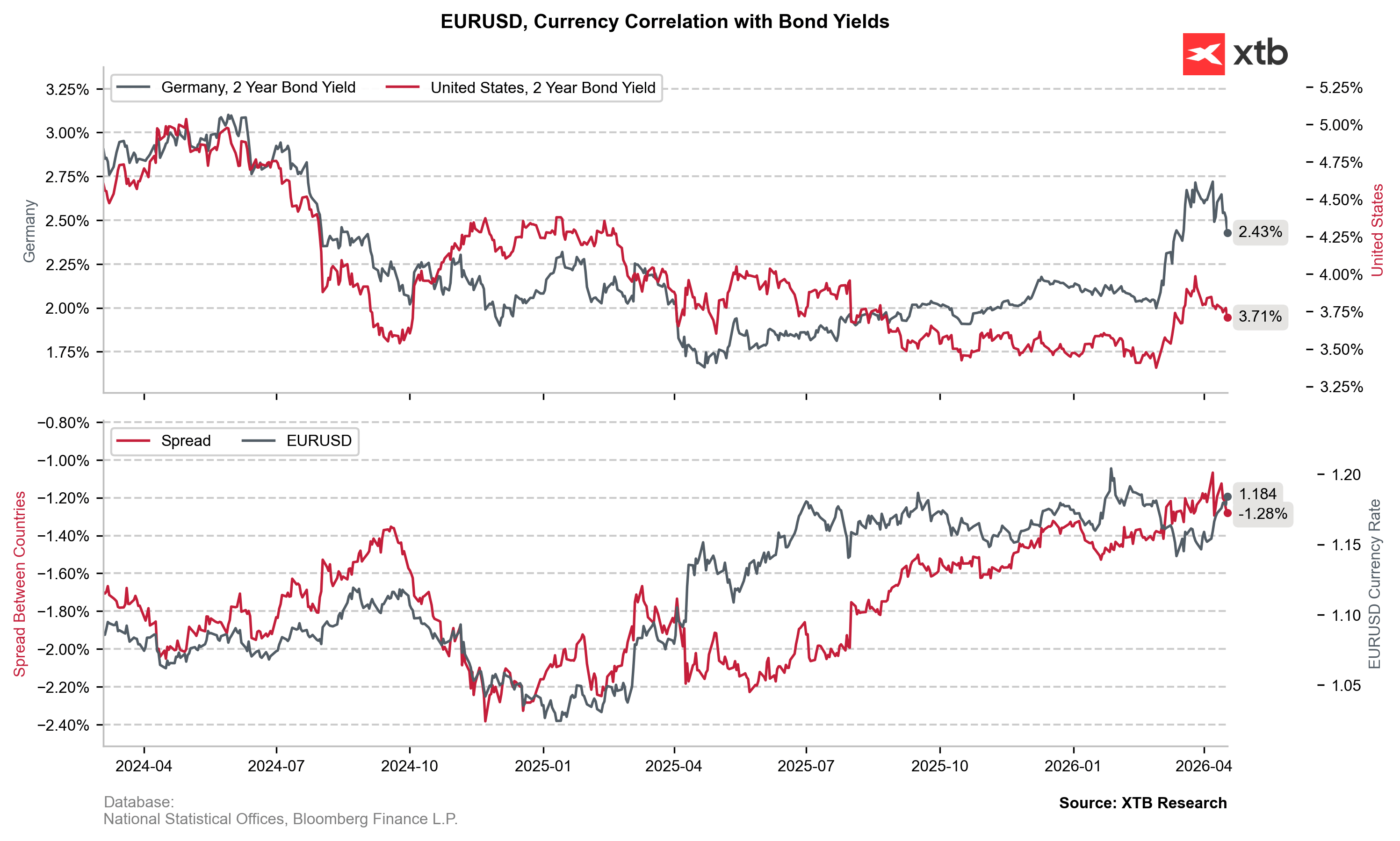 Kurz EURUSD v podstatě dohnal spread mezi dvouletými výnosy Německa a USA, který stabilně rostl navzdory geopolitickému chaosu. Zatímco možný konec války a otevření Hormuzského průlivu snižují riziko zvyšování sazeb na obou stranách Atlantiku, ECB by měla zůstat relativně jestřábější než Fed, pro který předválečný scénář počítal s dalším snižováním sazeb, a tedy i s tlakem na oslabování dolaru. Zdroj: XTB Research