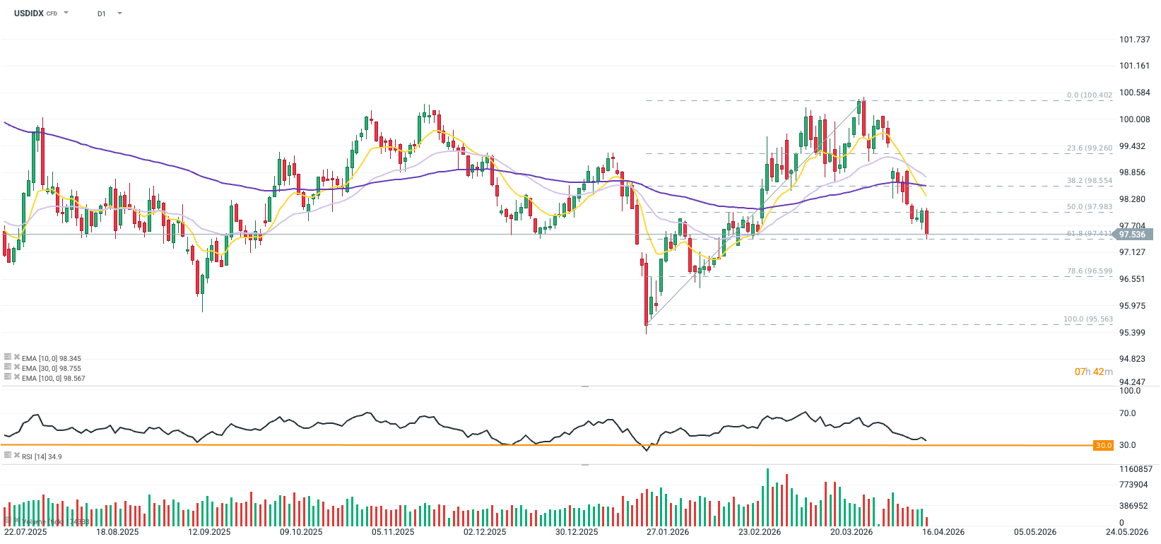 Propad ropných kontraktů stáhl dolar dolů s sebou, když americká měna odevzdala zisky nabrané kvůli geopolitické nejistotě. USDIDX se obchoduje na nejnižší úrovni za více než 1,5 měsíce a medvědí momentum potvrzuje překřížení EMA10 pod EMA30 a EMA100. RSI zatím nekleslo pod hranici překoupenosti, i když se cena zastavila na úrovni 61,8% Fibonacciho retracementu poslední rostoucí vlny. Zdroj: xStation5