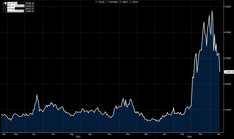 Cena nafty na burze v Rotterdamu se dnes v korunách propadla o mimořádných více než 14 % (viz 1. graf níže). Nafta u českých čerpacích stanic tak v úterý klesne o zhruba 2 Kč/l, s pomocí vládního stropu. Průměrně celorepublikově se nejspíše bude prodávat pod 41 Kč/l, například u Tank ONO pod 40 Kč/l.