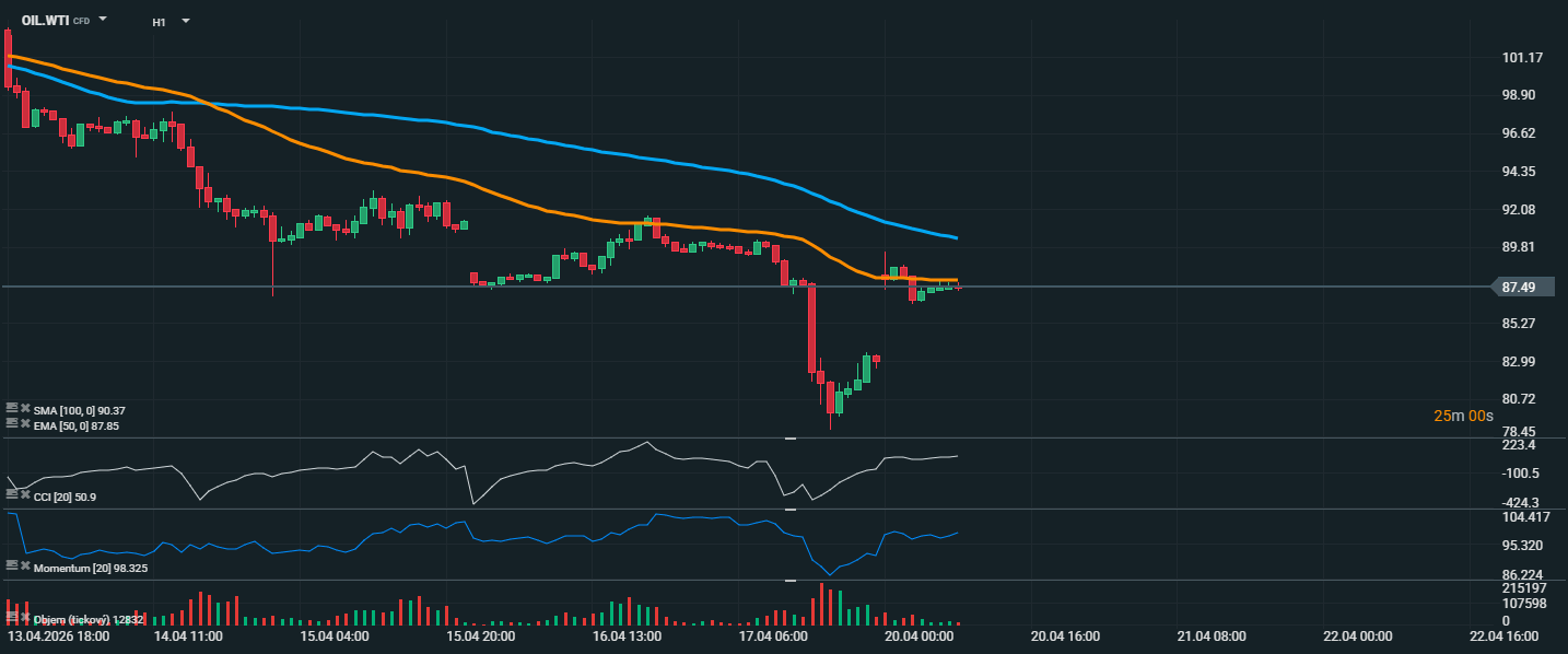 Cena ropy WTI se aktuálně pohybuje kolem 87,49 USD a po výrazném propadu z předchozích seancí se snaží stabilizovat. Trh je však stále v technicky slabším nastavení, protože cena se drží pod EMA 50 na úrovni 87,85 USD i pod SMA 100 na hodnotě 90,37 USD, což potvrzuje pokračující převahu prodejců. Krátkodobý pokus o odraz od lokálních minim zatím nepřinesl dostatečně silné potvrzení obratu, protože růst se zastavil právě v blízkosti krátkodobého klouzavého průměru.