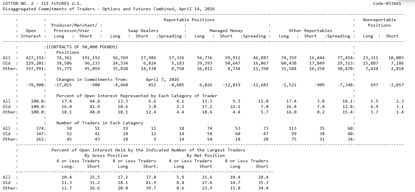 Hedgeové fondy a další správci peněz se u bavlny poprvé po zhruba dvou letech přiklonili k býčímu výhledu. Podle dat americké komise CFTC počet dlouhých pozic v týdnu do 14. dubna převýšil krátké o 16 825 kontraktů, což znamená obrat po dlouhém období negativního sentimentu.