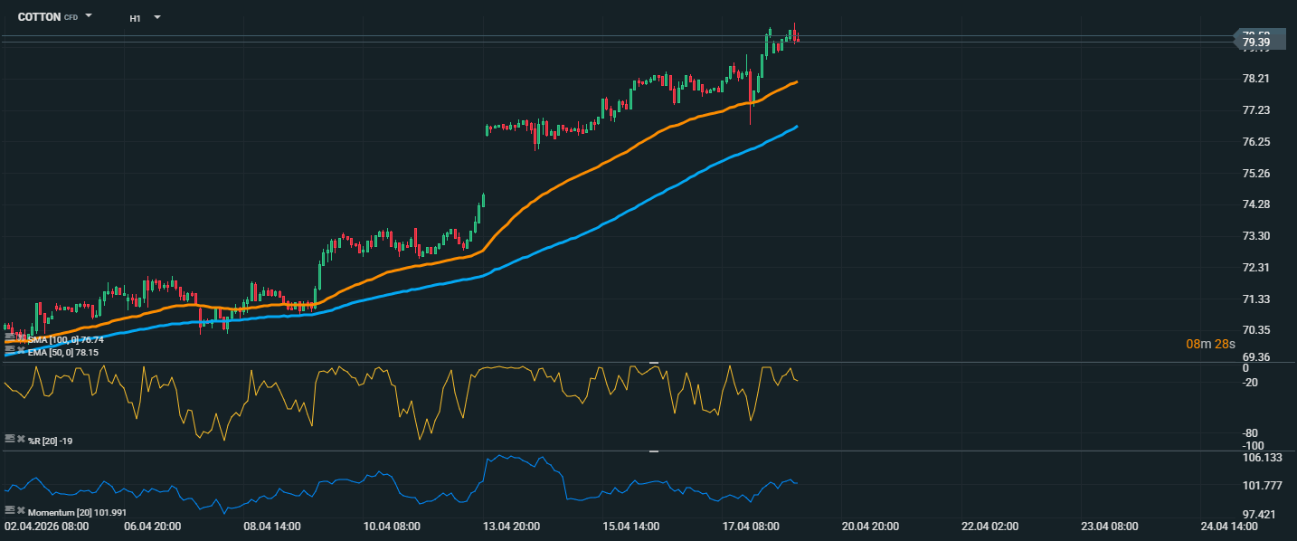 Cena bavlny se pohybuje kolem 79,39 USD a nadále si udržuje výrazně býčí nastavení. Trh v posledních dnech předvedl silný růstový trend, během kterého se cena postupně vzdálila od klouzavých průměrů a drží se nad EMA 50 na úrovni 78,15 USD i nad SMA 100 na hodnotě 76,74 USD. To potvrzuje, že kupci mají vývoj stále pod kontrolou a i přes mírné kolísání zůstává celkový trend jasně rostoucí.