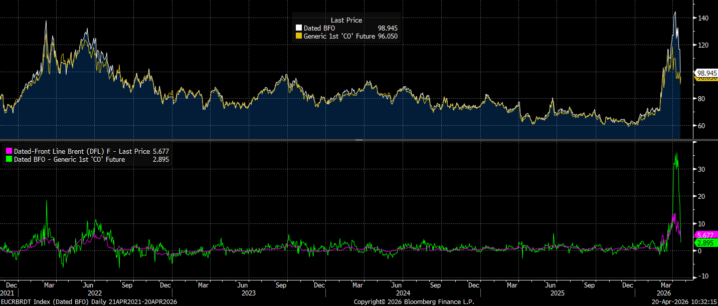 Dated Brent a nejbližší futures kontrakt na Brent na burze ICE. Na spodním grafu jsou rozdíly mezi Dated Brent a ICE, zatímco růžová linie představuje rozdíl mezi Dated Brent a Fair Value Brent od Bloombergu. Zdroj: Bloomberg Finance LP