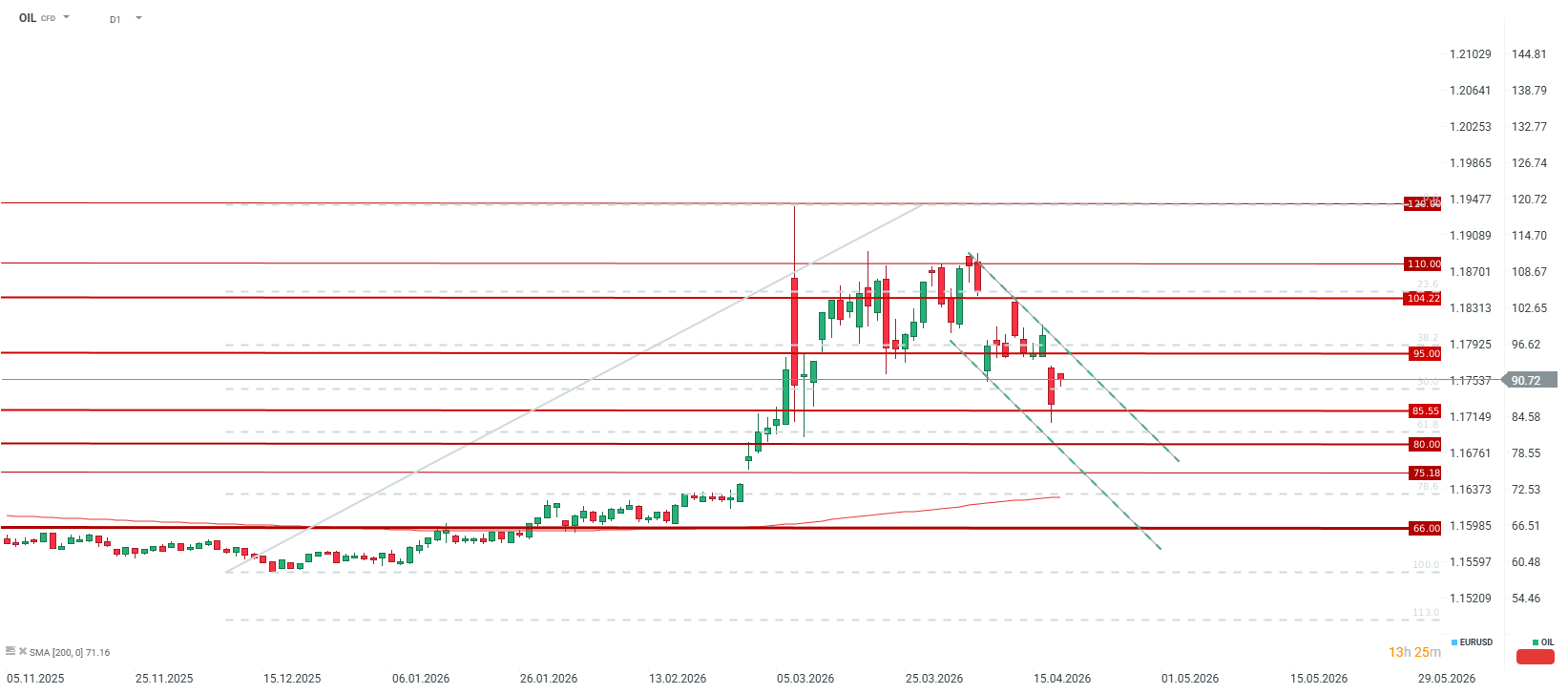 Cena ropy Brent otevírá výše, zároveň se však nezdá, že by futures trh byl eskalací situace výrazně znepokojen. Při obnoveném uzavření Hormuzského průlivu by ceny měly překonat hranici 100 USD za barel. Aktuálně se jako klíčová rezistence jeví oblast kolem 95 USD za barel, na úrovni 38,2% retracementu a horní hranice klesajícího trendového kanálu. Naopak pásmo 80 až 85 USD by se mohlo udržet při mírném zvýšení toku plavidel a případné úplné otevření Hormuzského průlivu spolu s návratem alespoň 50 % exportů z Perského zálivu by mohlo vést k návratu cen směrem k 75 až 80 USD za barel, šlo by však o mimořádně optimistický scénář.