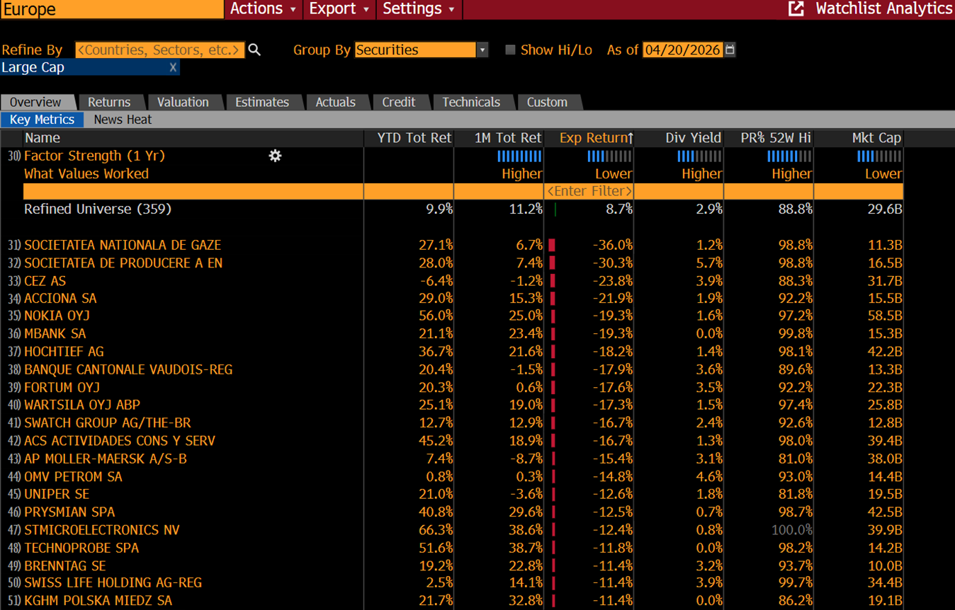 Dále, podle konsensu analytiků je nyní ČEZ třetí nejvíce nadhodnocenou ze 410 největších burzovně obchodovaných firem Evropy. Analytici i po lednovém propadu v konsensu očekávají ve zhruba ročním horizontu pokles akcií ČEZ o dalších zhruba 24 %. Více nadhodnocené jsou ze 410 velkých evropských firem (kategorie „mega cap“ a „large cap“), s jejichž akciemi se burzovně obchoduje, už jen dvě rumunské většinově státní energetické podniky (viz tabulka).