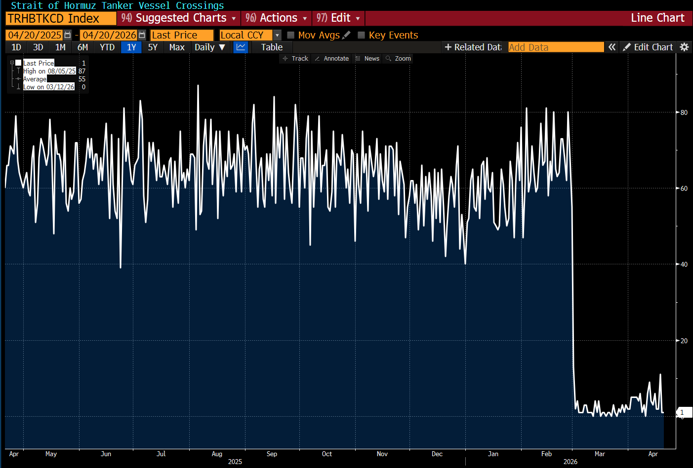 Nafta v Česku včera v průměru zlevnila na více než měsíční minimum, plyne z dat CCS. Za dva týdny vládního stropování cen nafta i přes nadále uzavřený Hormuzský průliv (viz graf Bloombergu níže: počet tankerů, které úžinu překonaly) zlevní o zhruba 8 Kč/l, z ceny 48,52, jež platila 7. dubna. Benzín zlevňuje též, byť ve znatelně menším rozsahu. Pro ekonomika je však důležitější cena nafty, která loni tvořila 73 procent spotřeby pohonných hmot.
