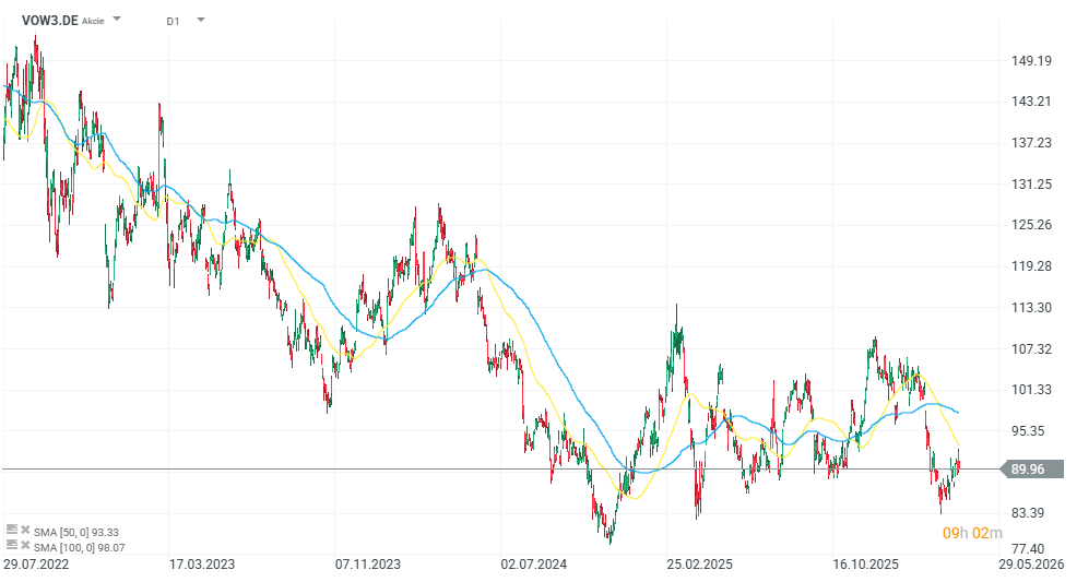 Problémy německého automobilového průmyslu podtrhuje i vývoj akcií Volkswagenu. Za posledních pět let akcie VW ztratily přibližně 60 % a aktuálně se obchodují kolem 90 EUR.