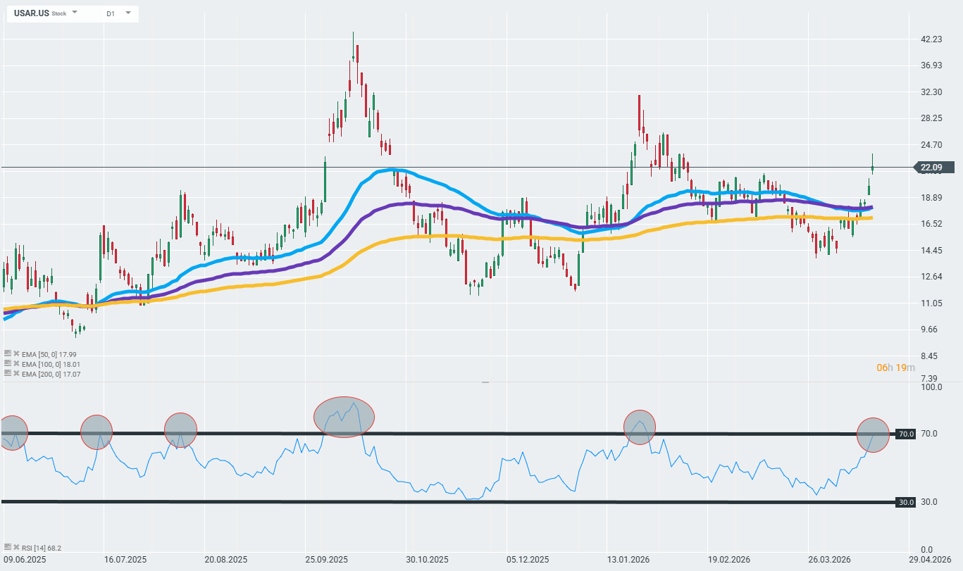 Cena akcií společnosti dnes prudce roste, i když zisky se s postupem druhé poloviny pondělní seance zmírňují. RSI při 14denním nastavení se navíc blíží hranici 70 bodů, na které v minulosti docházelo ke korekcím směrem dolů. Zdroj: xStation
