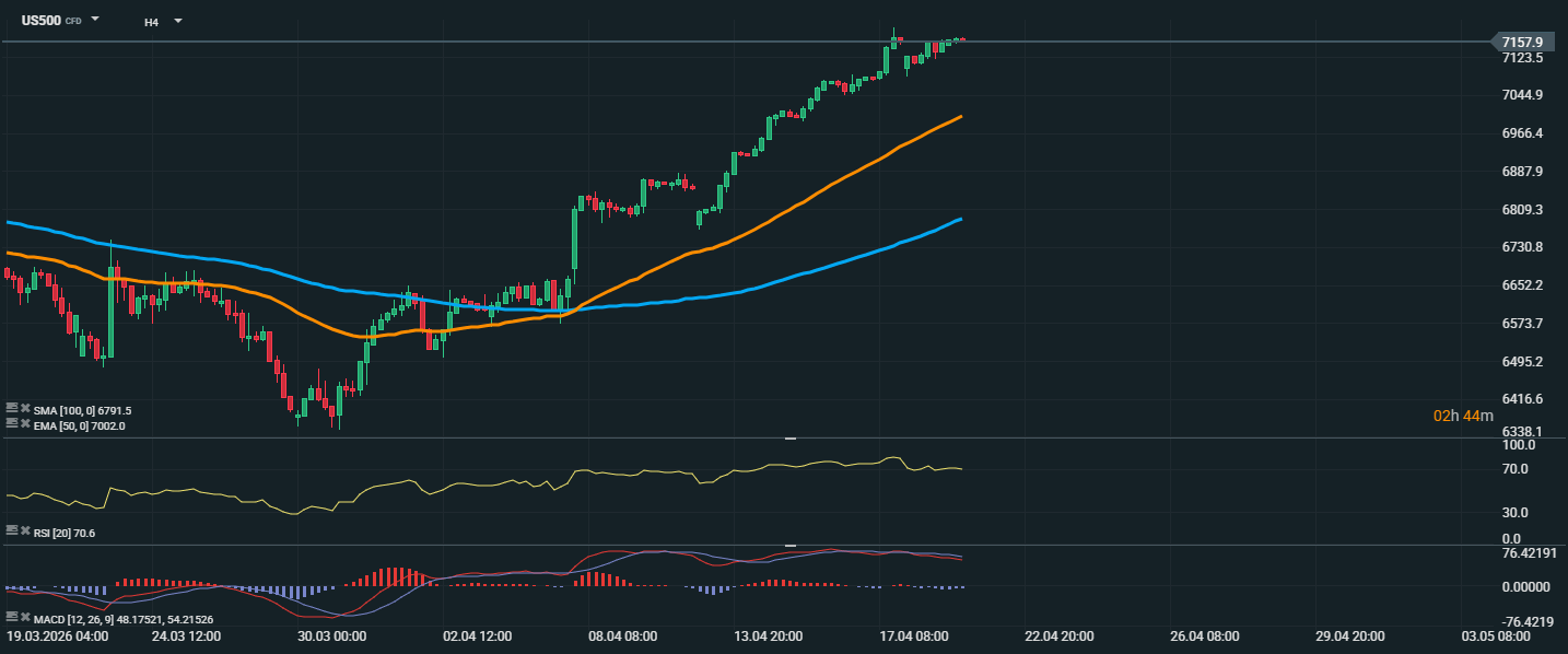 Index US500 pokračuje v silném růstovém trendu a aktuálně se obchoduje kolem 7123,5 bodu. Cena se drží výrazně nad klouzavými průměry, konkrétně nad EMA 50 na 7002,0 bodech a také nad SMA 100 na 6791,5 bodech, což potvrzuje pokračující převahu kupců. Po prudkém růstu z přelomu března a dubna se trh dostal až k důležité rezistenční oblasti poblíž 7157,9 bodu, kde nyní dochází ke krátké konsolidaci.