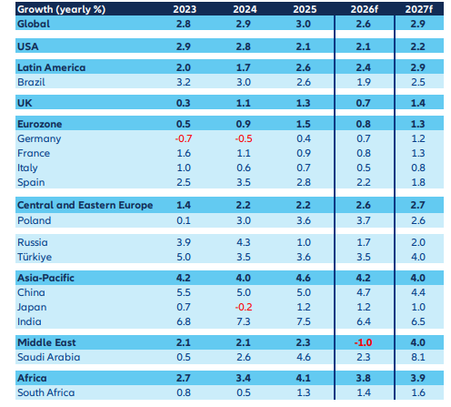 Dopad na růst HDP by se pohyboval od 0,2 procentního bodu v USA (na 2,1 % v roce 2026) po 0,4 procentního bodu v eurozóně (na 0,8 % v roce 2026). Analýza Allianz Trade předpokládá, že centrální banky tento dočasný cenový šok většinou přehlédnou, přičemž ECB a Bank of England zvýší sazby mírně o 25 bazických bodů v dubnu a FED ponechá sazby beze změny. Celkově by globální růst HDP měl v roce 2026 dosáhnout 2,6 %, oproti předpokládaným 3,1 % před konfliktem.