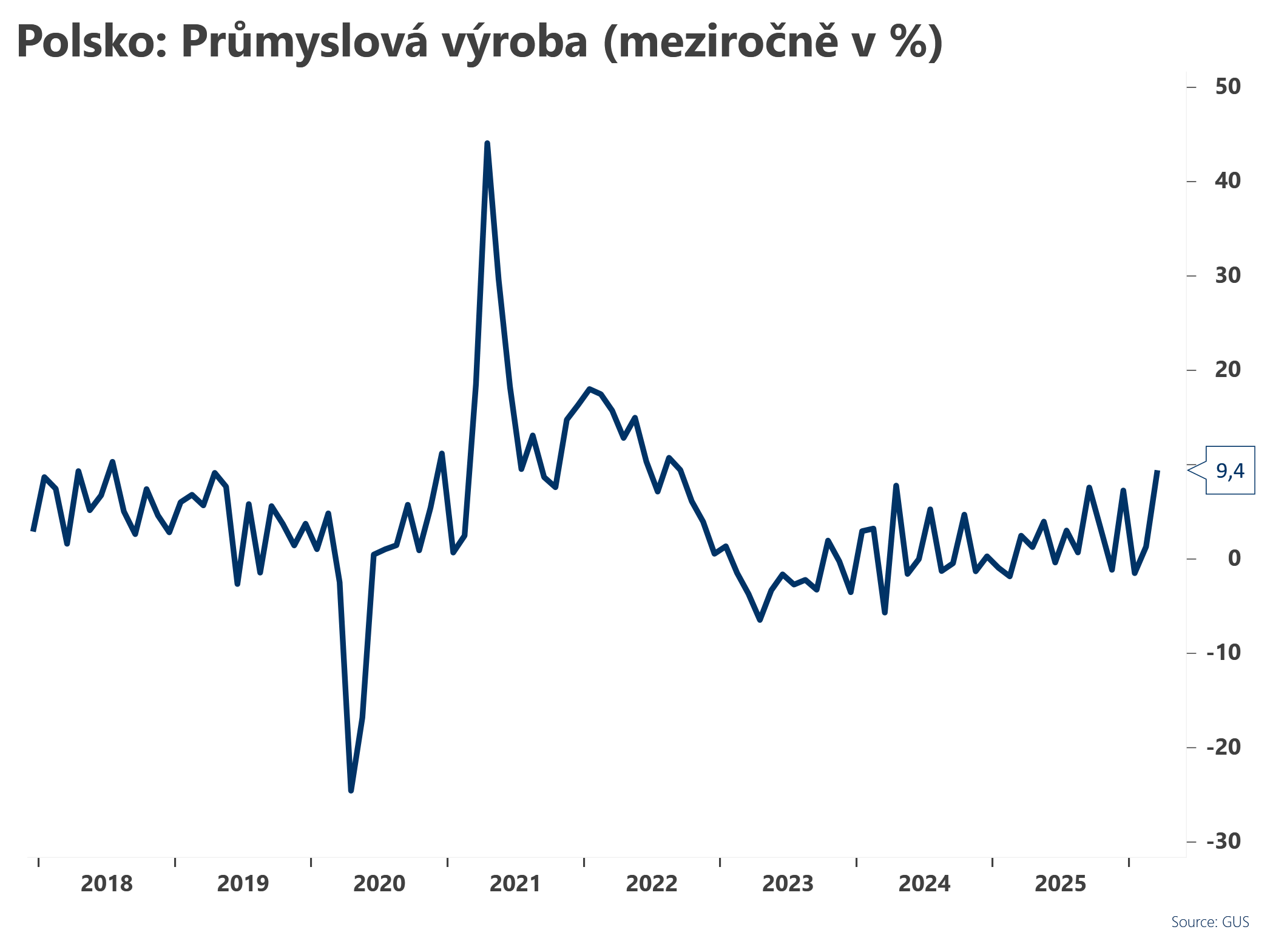 Průmyslová výroba v březnu výrazně překvapila, když meziročně vzrostla o 9,4 %, což je výrazně nad tržním očekáváním (4,2 %) i po únorové revizi na 1,3 % meziročně.