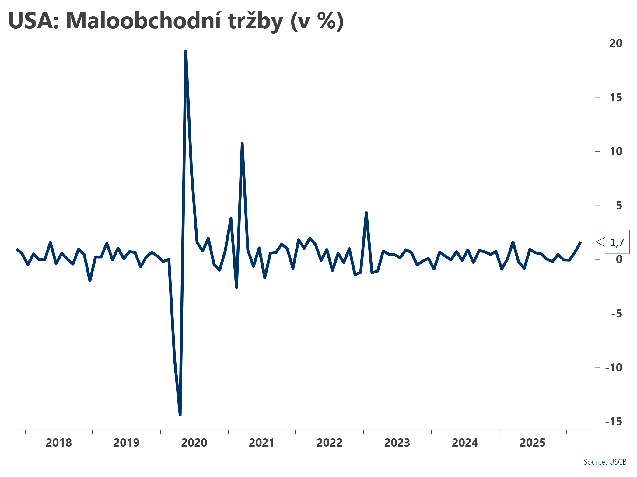 Maloobchodní tržby meziměsíčně vzrostly o 1,7 %, což je nad konsensem 1,4 %. Zároveň došlo k revizi únorového růstu na 0,7 %, což potvrzuje solidní dynamiku spotřebitelské poptávky na začátku roku.