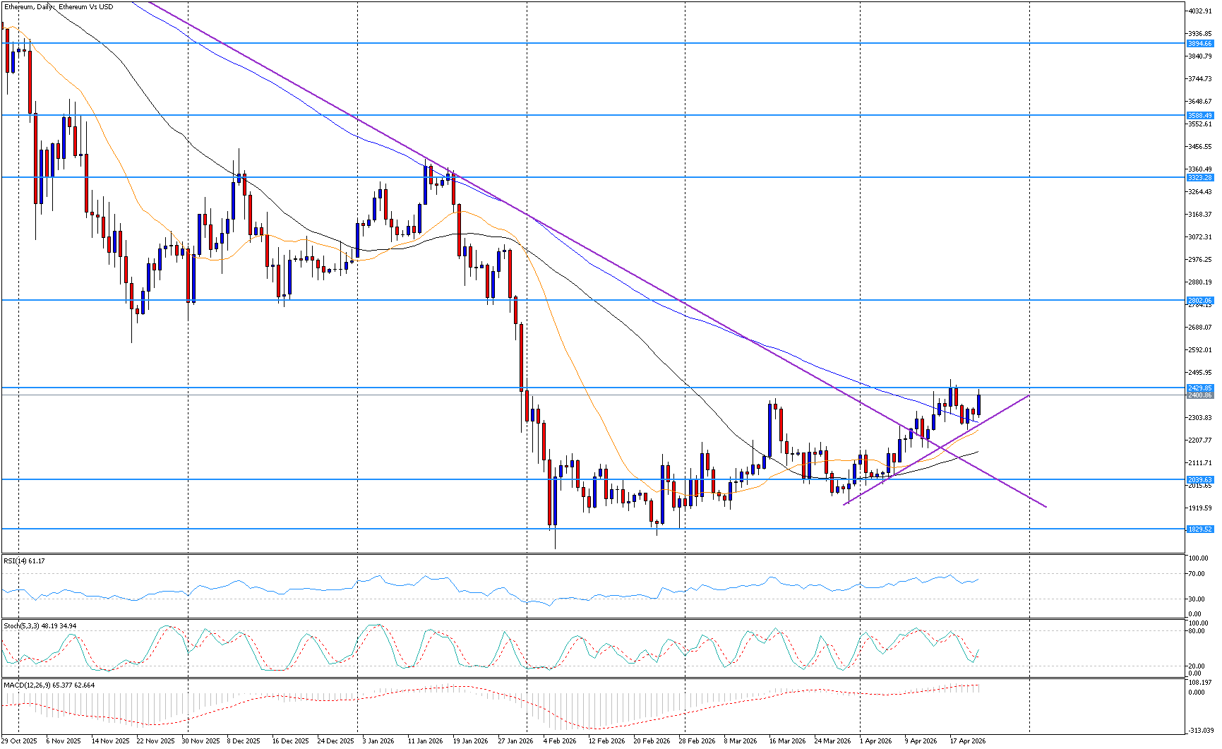 Ethereum si nadále udržuje pozitivní dynamiku a od začátku týdne postupně navyšuje své zisky, přičemž se opět přibližuje k důležité zóně rezistence kolem 2 400, která v minulosti opakovaně fungovala jako bod obratu. Růst je podporován kombinací zlepšujícího se globálního sentimentu, souvisejícího s vývojem mezi Washingtonem a Teheránem, a zároveň rostoucí poptávkou ze strany institucionálních investorů, kteří se postupně vracejí na kryptoměnový trh. Technická struktura zůstává příznivá, jelikož ethereum pokračuje ve vzestupném trendu započatém na konci března a udržuje se nad 100denním jednoduchým klouzavým průměrem, který aktuálně funguje jako klíčová dynamická podpora. Tento vývoj naznačuje, že kupující si nadále udržují kontrolu a že případné krátkodobé poklesy jsou zatím vnímány spíše jako příležitost k nákupům než jako začátek širší korekce. Indikátory momenta podporují tento konstruktivní výhled, i když zatím nenaznačují výrazně silný trend. RSI se drží nad neutrální úrovní 50, což signalizuje mírnou převahu kupujících, zatímco MACD zůstává v kladném teritoriu, což potvrzuje pokračující, avšak relativně vyvážený býčí tlak. Tento mix naznačuje, že trh má prostor pro další růst, ale zatím mu chybí silnější impuls pro výraznější akceleraci. Další vývoj bude do značné míry záviset na reakci ceny v oblasti klíčové rezistence. Rozhodující denní uzavření nad aktuální zónou, a zejména nad nedávným maximem poblíž 2 462, by mohlo urychlit růst směrem k dalším technickým cílům v okolí 2 570 a následně k oblasti těsně pod 200denním klouzavým průměrem kolem 2 767. Naopak selhání v této oblasti by mohlo vést k opětovnému návratu do konsolidačního pásma. Na straně poklesu zůstává důležitá zóna podpory v rozmezí 2 133–2 275, kde se sbíhají krátkodobé i střednědobé klouzavé průměry spolu s rostoucí trendovou linií. Tato oblast by měla tlumit případné výprodeje a udržet strukturu trhu stabilní. Teprve její výraznější prolomení by otevřelo prostor pro hlubší pokles směrem k psychologické hranici 2 000. Celkově si ethereum udržuje pozitivní krátkodobý výhled, přičemž aktuální růst působí stabilně, avšak pro potvrzení silnějšího býčího trendu bude klíčové jasné překonání hlavní zóny rezistence.