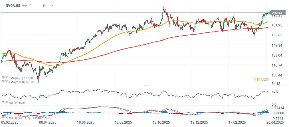 Akcie Nvidie se obchodují nad úrovní 200 USD a posunuly se přibližně o 8 % nad 200denní EMA (červená linie), což zvyšuje pravděpodobnost průrazu nad předchozí maxima z podzimu 2025.