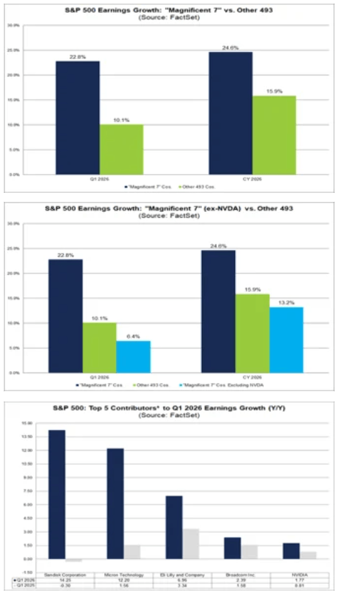 V posledních čtvrtletích se na Wall Street prosadil dominantní narativ, že za většinou růstu zisků v rámci indexu S&P 500 stojí takzvaná Magnificent 7. Data za 1. čtvrtletí 2026 však ukazují o něco nuancovanější obrázek. Zatímco velké technologické společnosti dál rostou rychleji než širší trh, podle společnosti FactSet tato výhoda z velké části mizí, pokud z analýzy vyřadíme Nvidii. Pro investory je to důležitý signál, protože ukazuje, že síla této skupiny není tak široce rozprostřená, jak by se mohlo zdát.