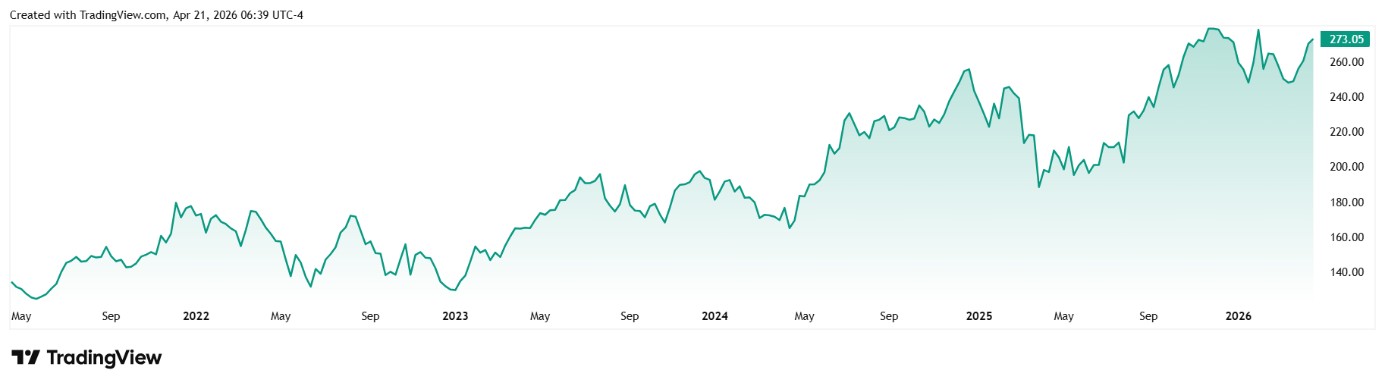 Výkonnost ceny akcií společnosti Apple za posledních 5 let