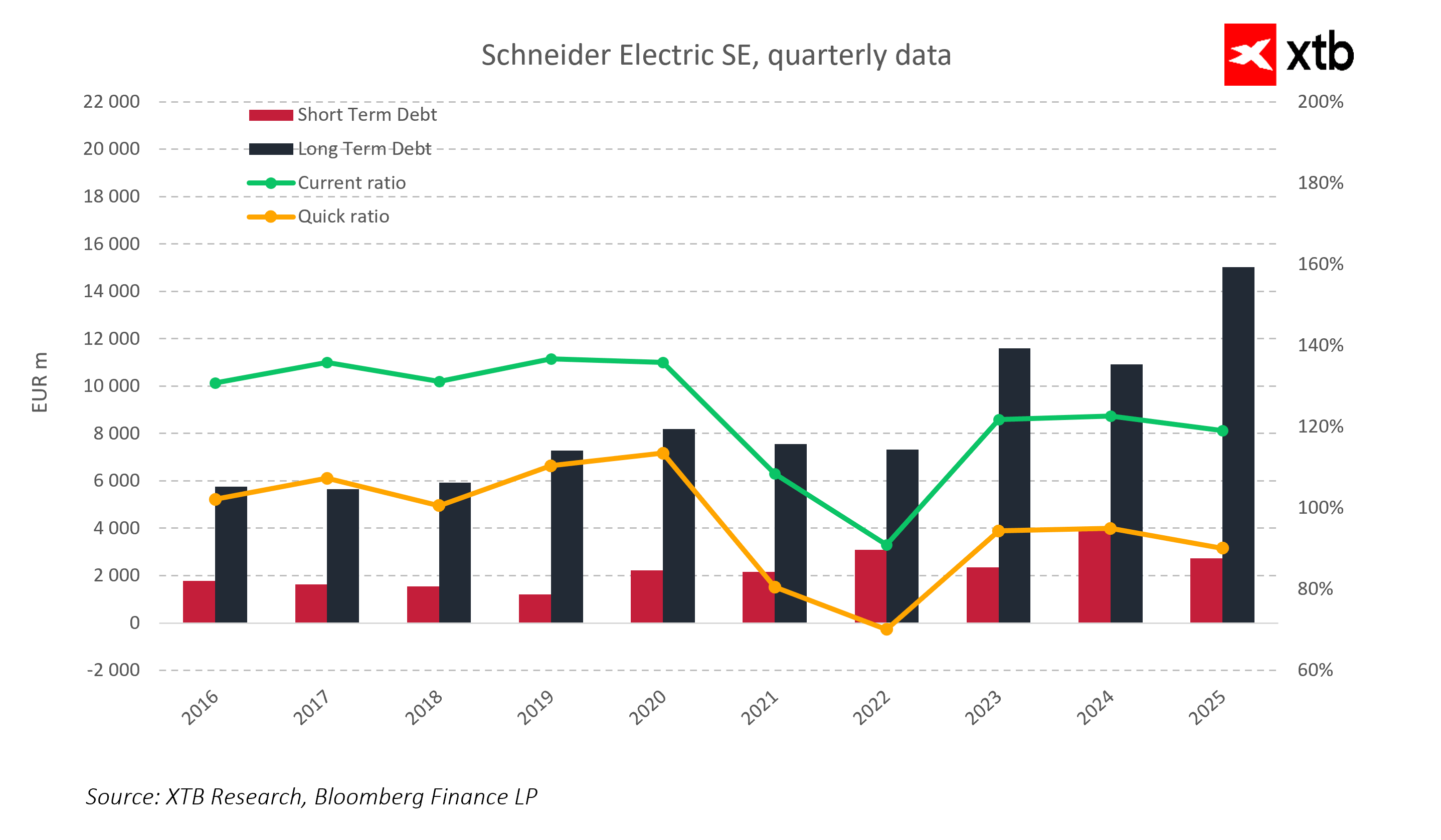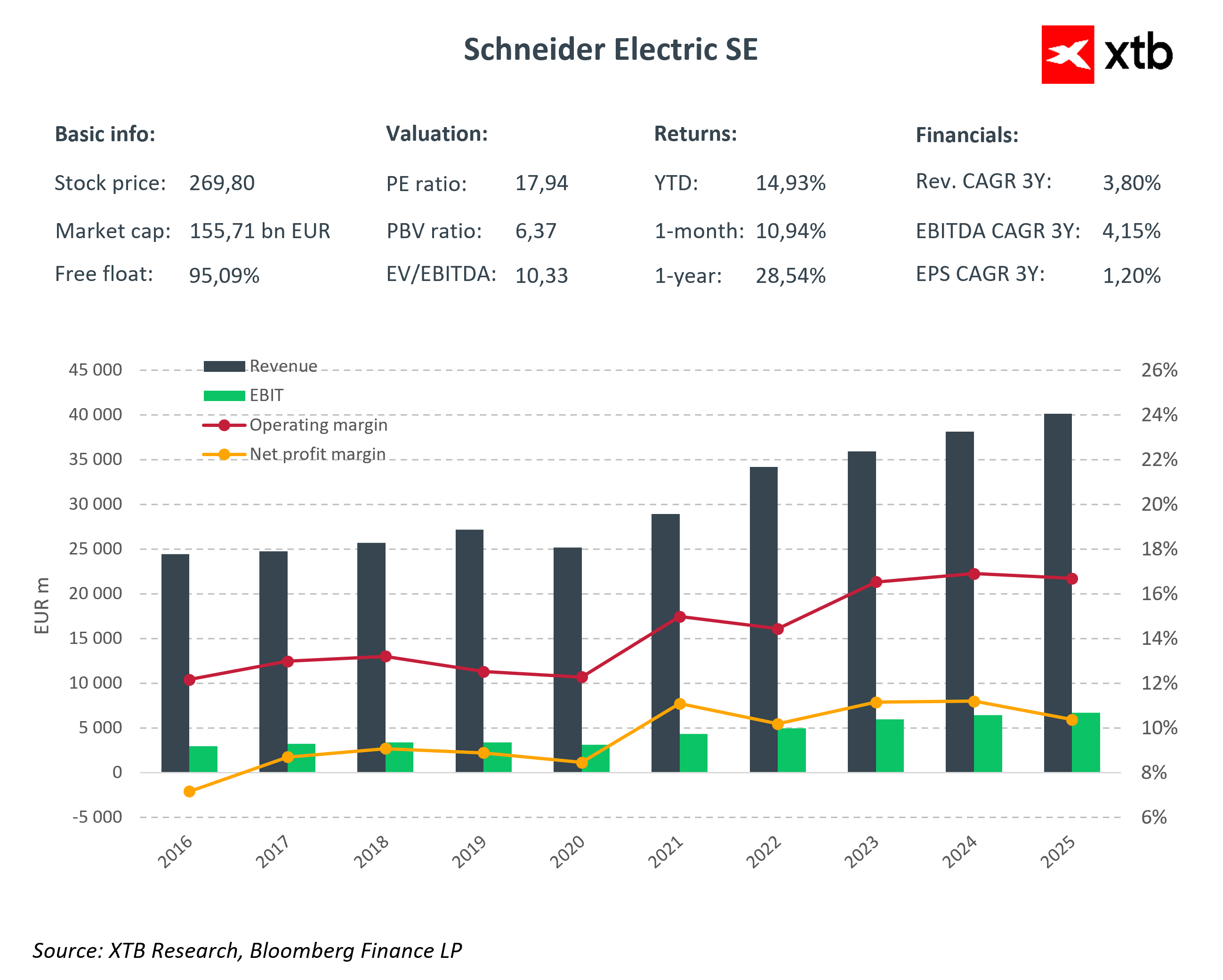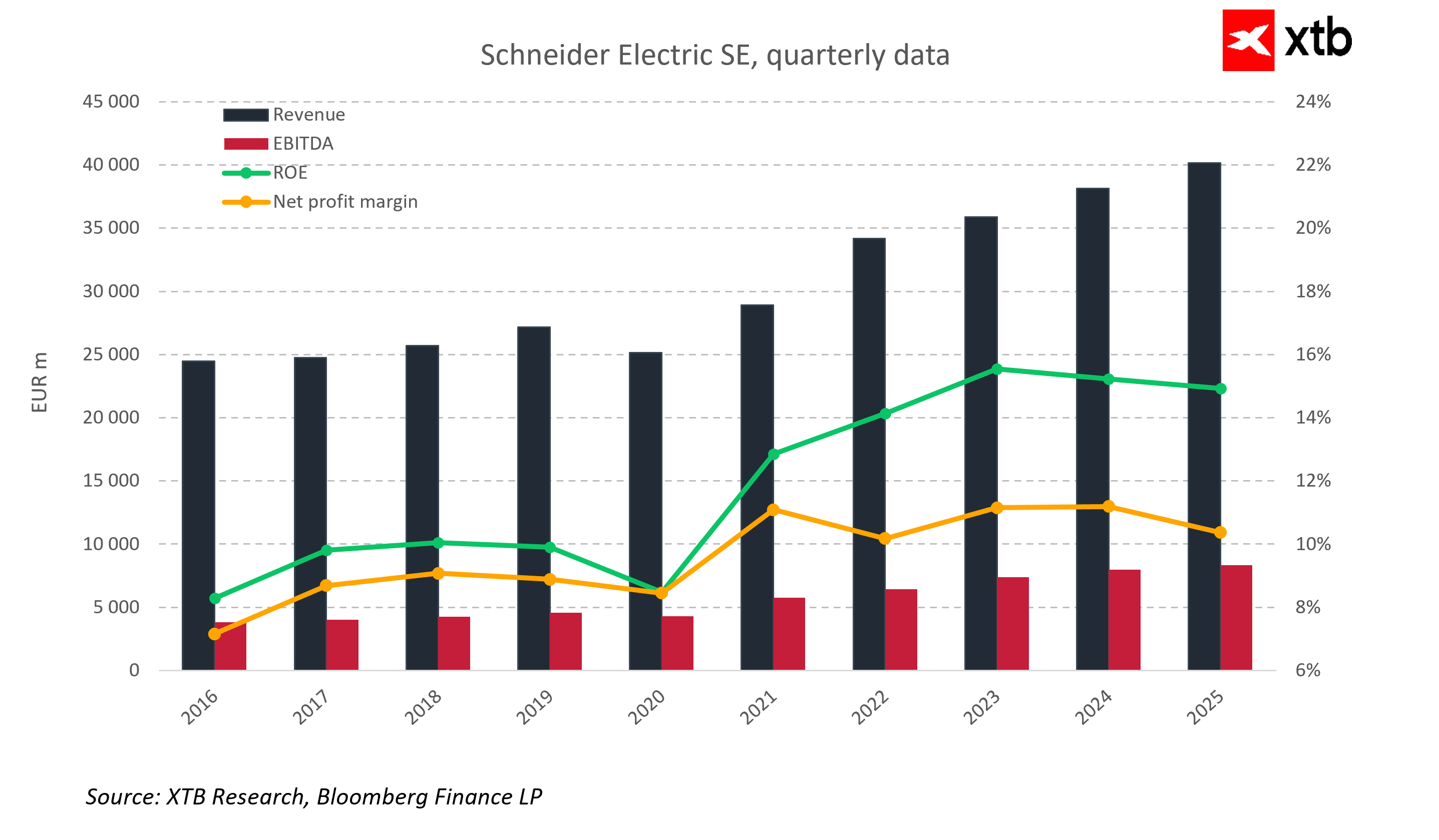 Schneider Electric je globálním lídrem v oblasti energetického managementu a automatizačních technologií, který těží z dlouhodobých strukturálních trendů, jako jsou digitalizace, elektrifikace, umělá inteligence a rostoucí investice do datových center a energetické infrastruktury. Společnost kombinuje hardware, software a služby, což jí umožňuje generovat stabilní cash flow a zvyšovat podíl opakovaných příjmů.