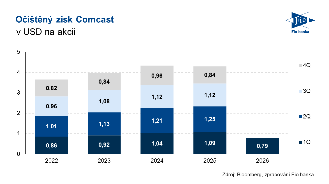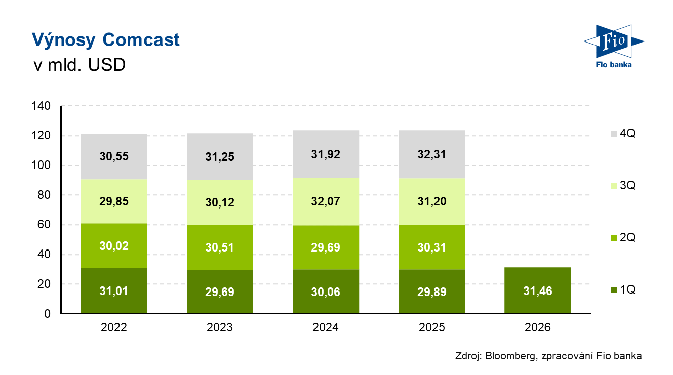 Americký telekomunikační a mediální konglomerát Comcast zveřejnil své výsledky hospodaření za čtvrtý kvartál roku 2025. Výnosy vzrostly meziročně o 1,2 %. Očištěný zisk na akcii meziročně poklesl, ale překonal očekávání trhu. Společnost vykázala výrazný meziroční nárůst volných peněžních toků, a to o 34 %. Comcast také pokračoval v návratu kapitálu akcionářům, vrátil jim 2,7 mld. USD prostřednictvím dividend a zpětného odkupu akcií. -