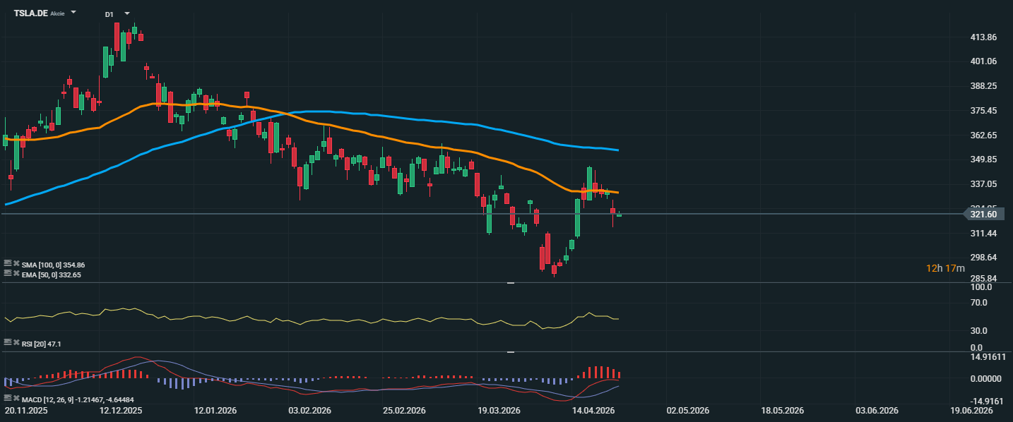 Akcie Tesly zůstávají v technicky slabším nastavení a aktuálně se pohybují kolem 321,60 EUR. Cena se stále nachází pod EMA 50 na úrovni 332,65 EUR i pod SMA 100 na hodnotě 354,86 EUR, což potvrzuje, že střednědobý trend zůstává spíše negativní. Krátkodobě se Tesla pokusila o obrat, když cena prudce vyskočila k oblasti 337 EUR, ale tento růst zatím nedokázala udržet. Aktuální návrat pod hladinu 321,60 EUR naznačuje, že kupci ztrácejí kontrolu a trh znovu testuje nižší úrovně. RSI se nachází na hodnotě 47,1, tedy těsně pod neutrální hranicí, což ukazuje na slabší momentum bez jasného signálu přeprodanosti.