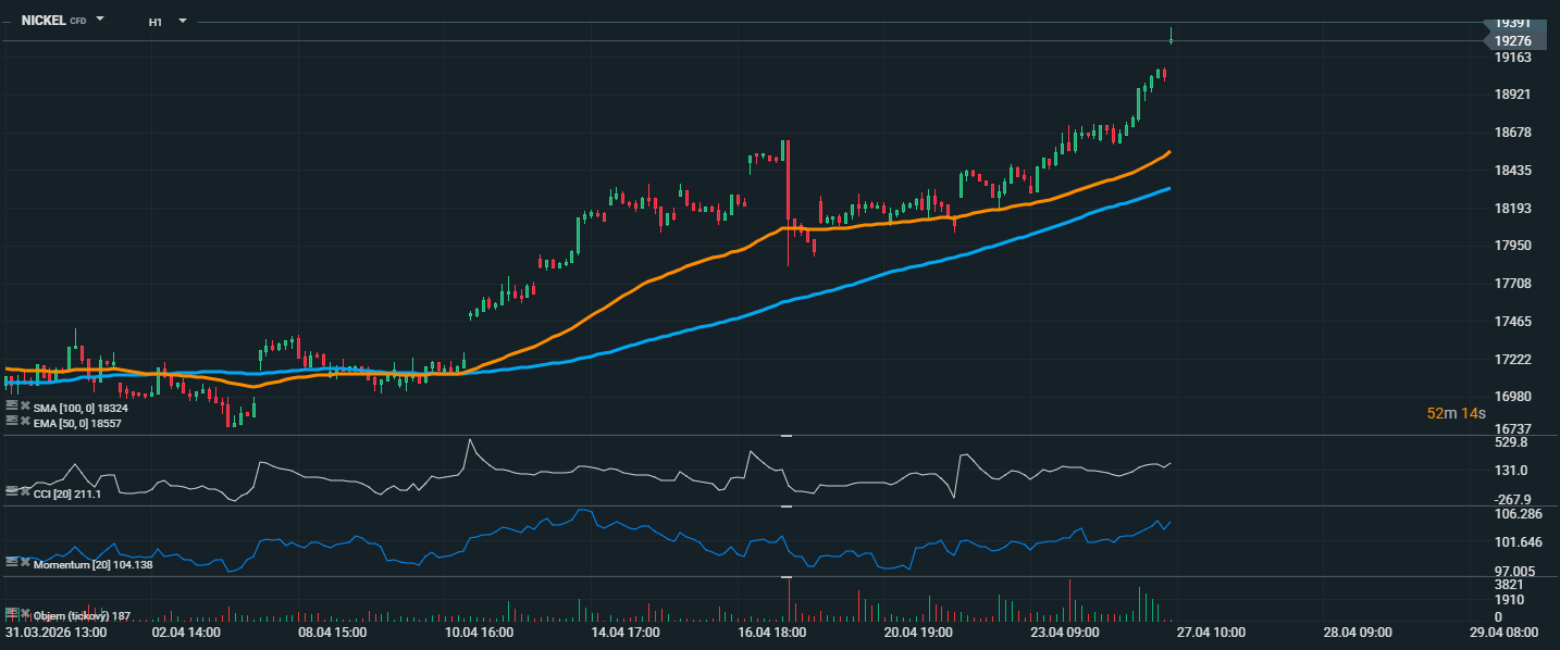 Cena niklu pokračuje v silném růstovém trendu a aktuálně se pohybuje kolem úrovně 19 276 USD za tunu. Trh se drží výrazně nad klouzavými průměry, konkrétně nad EMA 50 na hodnotě 18 557 USD i nad SMA 100 na úrovni 18 324 USD, což potvrzuje jasnou převahu kupců. Růst navíc výrazně zrychlil a cena se dostala až do blízkosti lokální rezistence kolem 19 391 USD. CCI se nachází na hodnotě 211,1, tedy hluboko v překoupené oblasti. To ukazuje na velmi silné růstové momentum, ale zároveň zvyšuje riziko krátkodobého výběru zisků. Momentum na hodnotě 104,1 rovněž potvrzuje pokračující sílu trendu a naznačuje, že kupci mají trh stále pod kontrolou. Objem obchodů se v závěru růstu zvýšil, což podporuje důvěru v aktuální průraz směrem vzhůru.