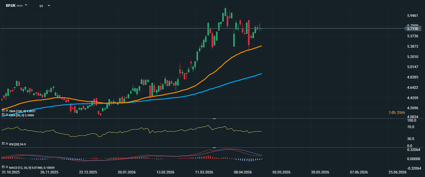 Akcie BP se drží po výrazném růstovém trendu ve fázi konsolidace a aktuálně se obchodují kolem úrovně 5,71 GBP. Cena zůstává nad EMA 50 na hodnotě 5,3980 GBP i nad SMA 100 na úrovni 4,8927 GBP, což potvrzuje, že širší technické nastavení zůstává stále býčí. Po prudkém růstu z března však trh zatím nedokáže navázat na předchozí maxima a pohybuje se spíše do strany. RSI se nachází na hodnotě 54,9, tedy v neutrálním pásmu. To naznačuje, že akcie nejsou překoupené, ale zároveň momentálně chybí silnější nákupní impuls.
