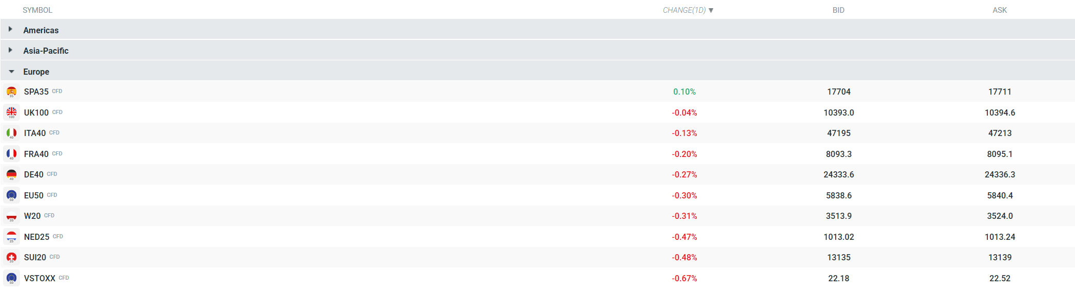 Aktuální ceny evropských kontraktů. Zdroj: xStation