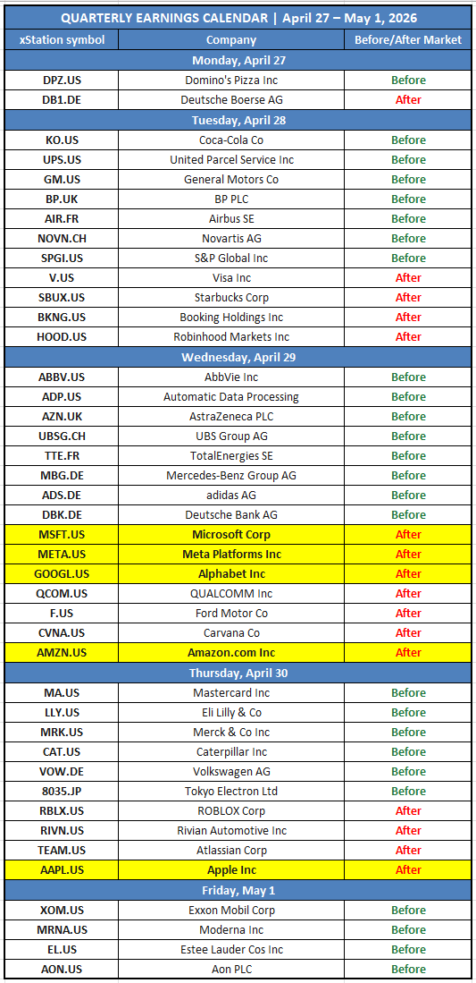 • Klíčový týden pro makroekonomické i firemní zprávy: Fed ve středu, ECB a BoE ve čtvrtek, dále BoJ a BoC. Data: americké PCE, HDP a ISM Manufacturing PMI. Tržby reportuje pět společností z „Mag 7“. Jakékoliv zklamání při současných valuacích by mohlo vyvolat prudkou korekci z historických maxim.
