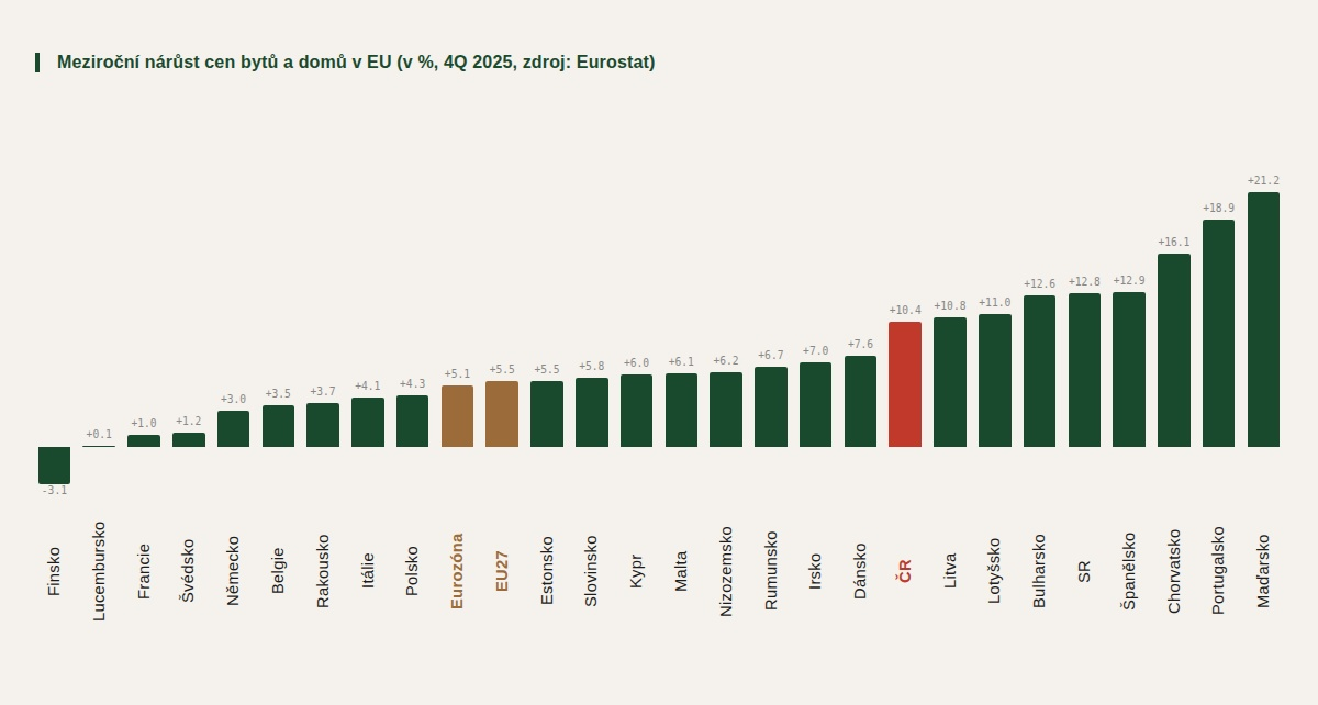 V Česku i na Slovensku patří bydlení dlouhodobě mezi klíčová společenská témata, zejména pokud jde o vývoj cen, dostupnost bydlení a výstavbu nových nemovitostí. Ceny bytů a domů ovlivňuje celá řada faktorů, především vztah mezi nabídkou a poptávkou, výše úrokových sazeb u hypoték, lokalita nebo celkový ekonomický vývoj. Jak si Česko stojí v porovnání s ostatními zeměmi Evropské unie? Na tuto otázku odpovídá Eva Sadovská, analytička WOOD & Company, která se ve své aktuální analýze zaměřila na nejnovější data Eurostatu za čtvrté čtvrtletí 2025.