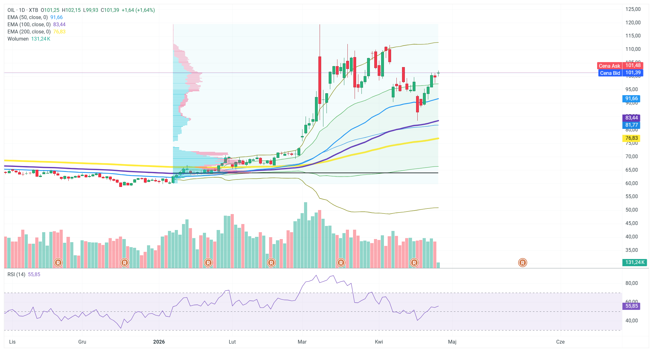 Ropa Brent zahájila nový týden růstem a obchoduje se na úrovni 101,56 USD za barel (+1,81 %), přičemž denní maximum dosáhlo 102,15 USD. Na denním grafu se cena jasně vzdálila od klíčových klouzavých průměrů. EMA 50 je na úrovni 91,66 USD, EMA 100 na 83,44 USD a EMA 200 na 76,83 USD. To potvrzuje silný uptrend, který trvá už mnoho týdnů. RSI(14) na hodnotě 56,01 ukazuje na mírné růstové momentum bez známek překoupeného trhu.