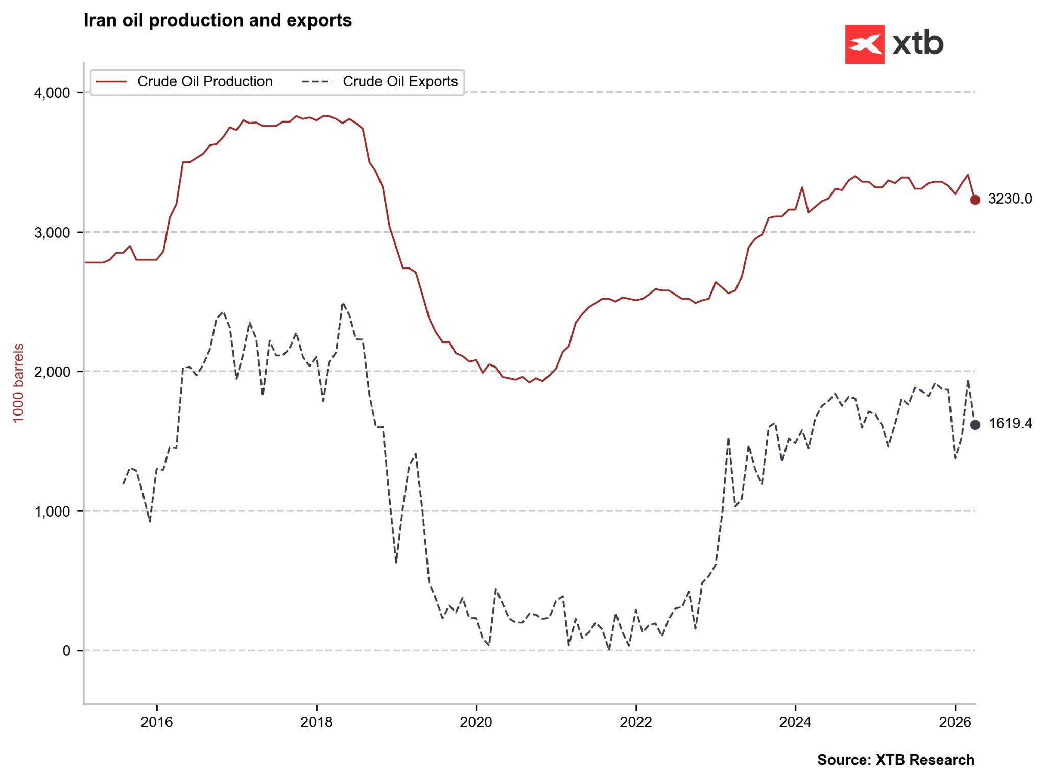 Během prvního Trumpova prezidentství klesla íránská produkce z přibližně 3,9 milionu barelů denně na pouhé 2 miliony barelů denně. Nedostatečné vymáhání sankcí během Bidenova prezidentství vedlo k oživení produkce. Od roku 2024 se pohybovala poblíž 3,3–3,4 milionu barelů denně. Exporty během Trumpova prvního mandátu klesly téměř na nulu. Írán si však zachovává určité tranzitní možnosti přes Kaspické moře, například pomocí swapů, což znamená, že exporty pravděpodobně neklesnou na absolutní nulu. Zdroj: Bloomberg Finance LP