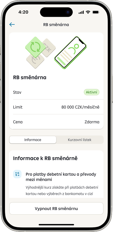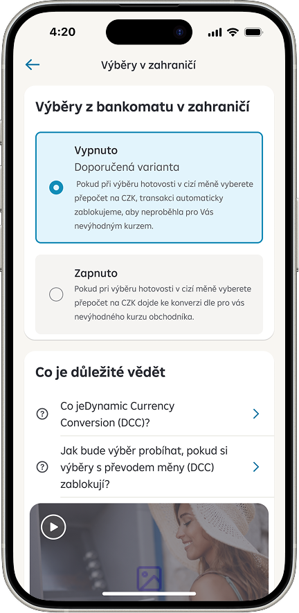 Úpravou prošlo i nastavení výběrů z bankomatu v zahraničí s převodem měny. Nové zobrazení klientům srozumitelněji vysvětluje rozdíly mezi jednotlivými možnostmi a pomáhá jim vyhnout se nevýhodným kurzům.