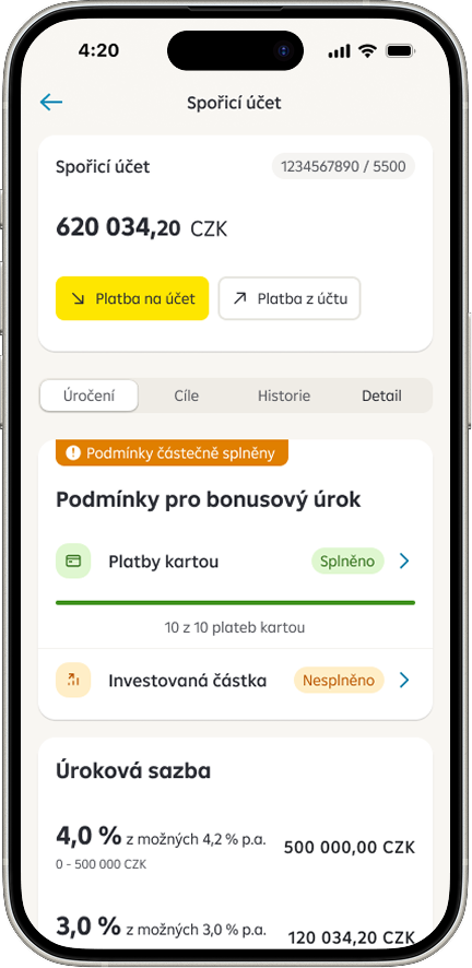 Od 1. května 2026 banka upravuje podmínky pro získání bonusové úrokové sazby na spořicích účtech. Nově mohou klienti díky investování dosáhnout na ještě vyšší bonusový úrok. Vše je přehledně dostupné přímo v detailu účtu na záložce Úročení, kde klienti vidí plnění jednotlivých podmínek i aktuální výši úrokové sazby podle dosaženého pásma. Díky tomu mají okamžitý přehled o tom, jak si vedou, a co mohou udělat pro maximální zhodnocení svých úspor.