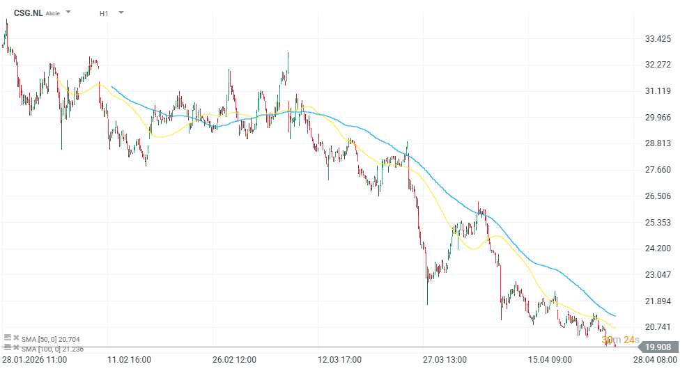 Akcie CSG ze svých maxim odepsaly již téměř 45 %, na maximech se akcie obchodavaly za 35 € . Ve srovnání s upisovací cenou 25 € jde o pokles přibližně 20 %. Od svého vstupu na burzu, který proběhl 23. ledna, tak akcie nezažívají dobré období a sentiment kolem titulu je aktuálně výrazně negativní.