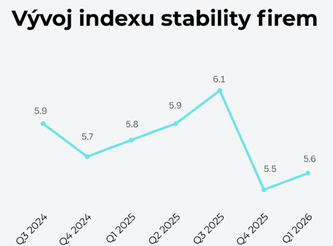 Stabilita českých firem se v 1. čtvrtletí 2026 po výrazném poklesu na konci roku 2025 přestala dále zhoršovat. Index stability firem, který vydává Mezinárodní obchodní komora v ČR (ICC CZ), mezikvartálně vzrostl o 0,1 bodu na hodnotu 5,6 bodu (na škále 0 až 10). Navzdory tomuto mírnému zlepšení zůstává stabilita podniků na relativně nízké úrovni.