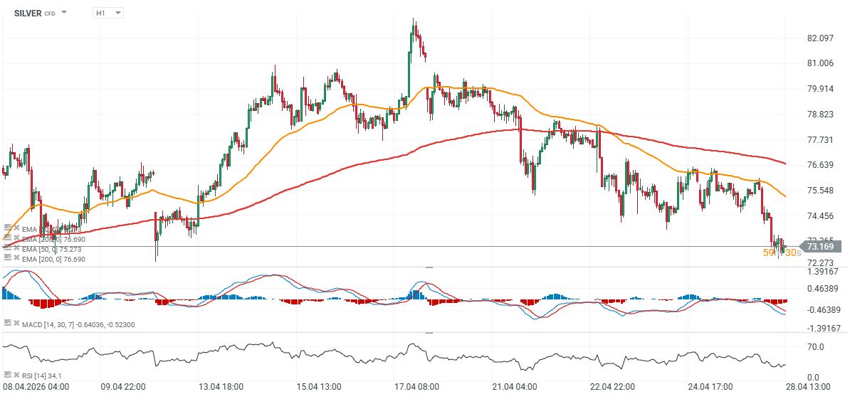 Stříbro kleslo o 12 % ze svých lokálních maxim a pohybuje se poblíž 73 USD za unci, což je zhruba o 40 % níže než 120 USD za unci zaznamenaných na přelomu ledna a února.
