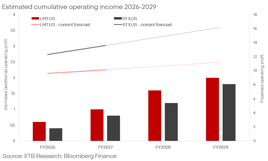 Při konzervativním předpokladu 25 miliard USD by to znamenalo tržby přibližně 11–13 miliard USD pro RTX a zhruba 13–16 miliard USD pro Lockheed Martin.