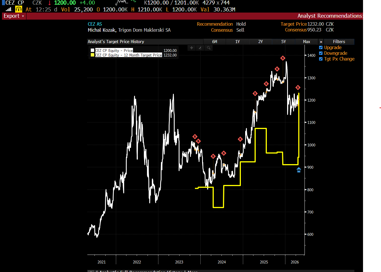 Přitom před pouhým týdnem Trigon stanovil svoji cílovou cenu akcií ČEZ na úrovni 943 Kč. Nyní ji tedy zvedl o mimořádných více než 30 procent. To je v historii stávajícího analytického pokrývání akcií ČEZ Trigonem skutečně ojedinělý nárůst (viz graf Bloombergu: žlutá křivka).
