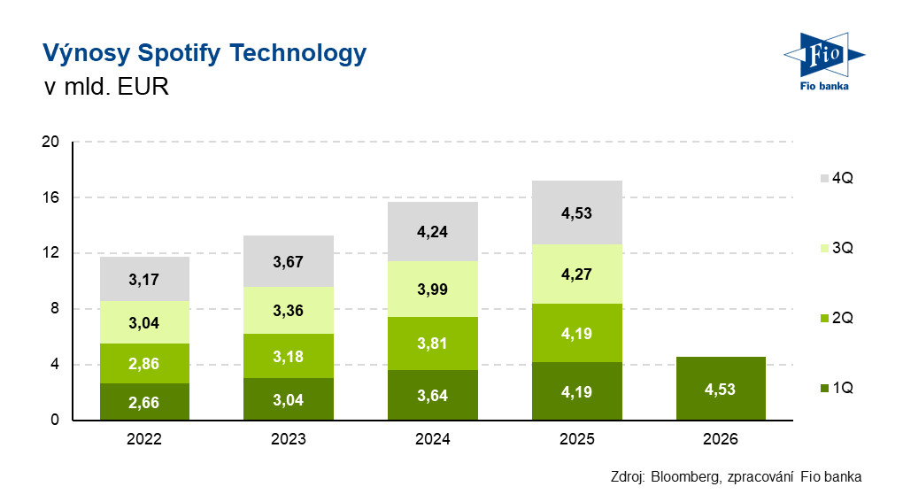 - Z toho výnosy z předplatného (Spotify Premium) vzrostly o 10 %, respektive o 15 % na konstantní měnové bázi na 4,15 mld. EUR při očekávání 4,11 mld. EUR.
