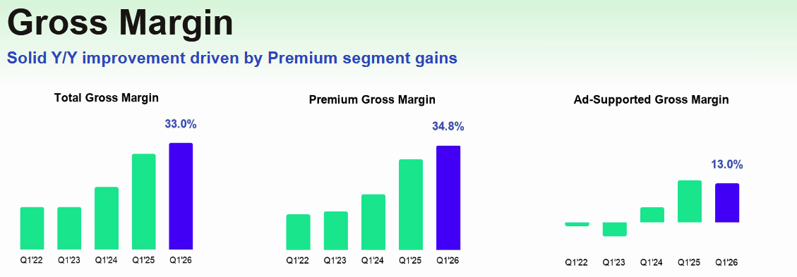 Analytička Geetha Ranganathan z Bloomberg Intelligence uvedla, že nevýrazný výhled hrubé marže pro 2Q naznačuje pouze velmi mírnou expanzi z 33 % v 1Q, což přiživí obavy, že AI hudba ukrajuje tržní podíl, nehledě na obavy, že růst marží bude omezen zvyšováním sazeb v rámci nových smluv „Streaming 2.0“ s vydavatelstvími jako Universal Music. Kromě toho výhled provozní marže pro 2Q nenaplnil konsensus zhruba o 6,5 %, k čemuž částečně přispěly sociální odvody, zatímco dynamika předplatitelů zůstává solidní, a to i přes nedávné zvýšení cen.