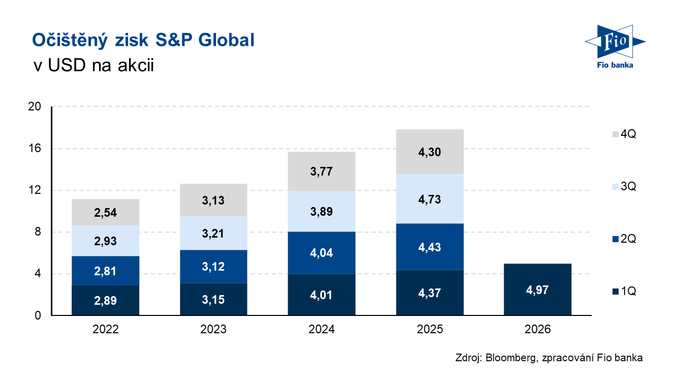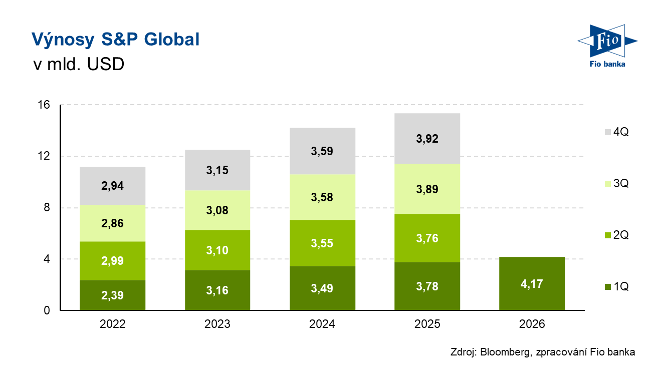 Americká společnost S&P Global, která poskytuje finanční data, úvěrové ratingy a skládá světové burzovní indexy, zveřejnila výsledky hospodaření za první kvartál roku 2026. Výnosy, které vzrostly meziročně o 10 % na 4,17 mld. USD, a očištěný zisk na akcii, ve výši 4,97 USD, mírně překonaly tržní očekávání. Firma mírně aktualizovala svůj celoroční výhled a letos plánuje vrátit svým akcionářům 100 % nebo více volného hotovostního toku prostřednictvím dividend a zpětných odkupů akcií.