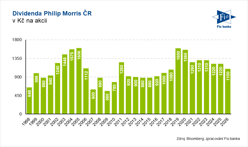 Představenstvo Philip Morris ČR navrhlo výplatu dividendy v hrubé výši 1 100 Kč na akcii. Nyní ji musí schválit valná hromada 29. května. Datum splatnosti je 13. červenec 2026. Výplatní období bude od 13. července 2026 do 31. března 2027.